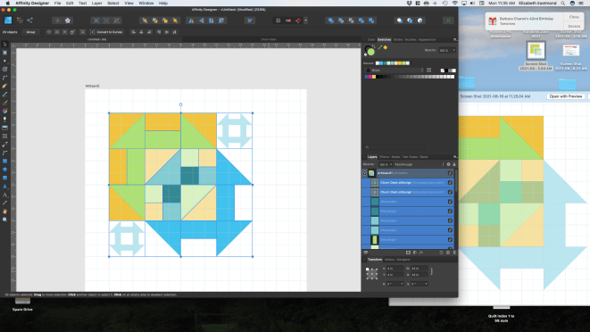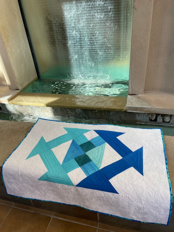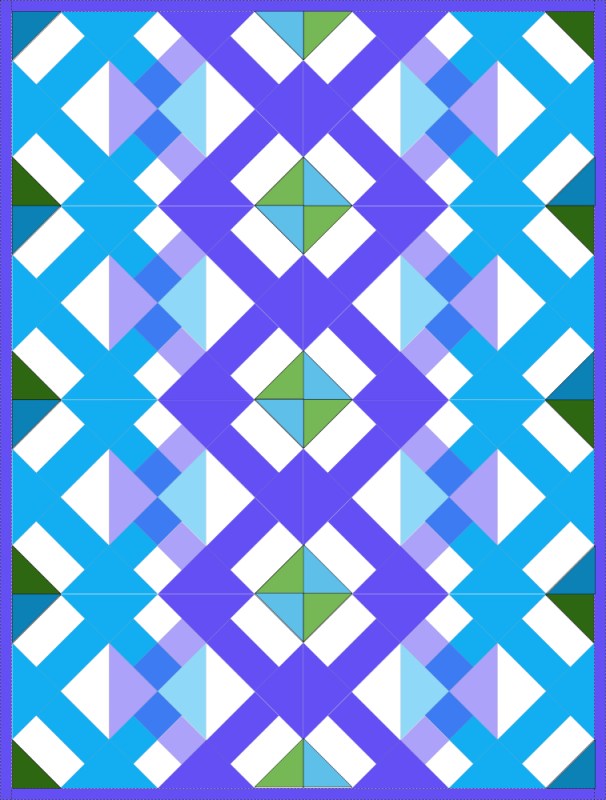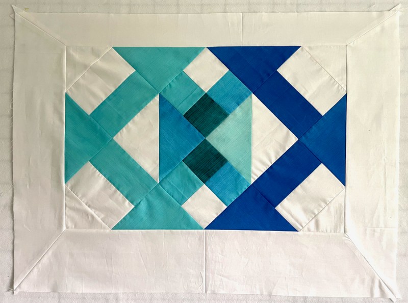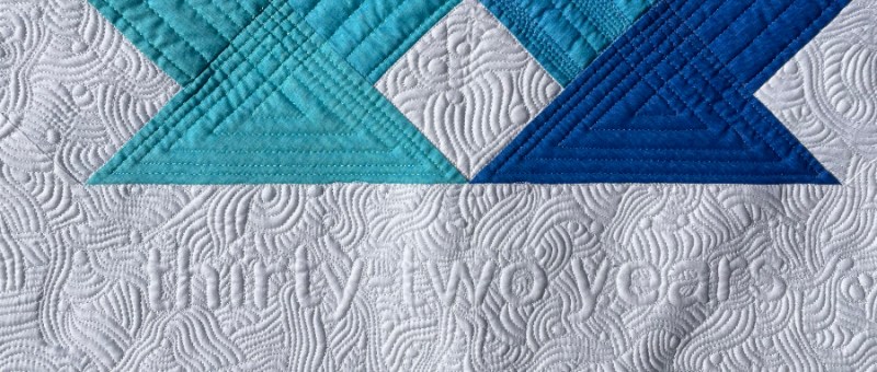After I’d merged the two blocks, late one night (tired) I sat and studied it. The deep blue color was strong and I liked the aqua color and I really liked where they merged in the middle, retaining something of themselves, but blending by giving a little of their color to the other, making a new hue. Yep, I thought, reflecting on our recent thirty-second wedding anniversary, this little bit of a quilt is just like marriage.