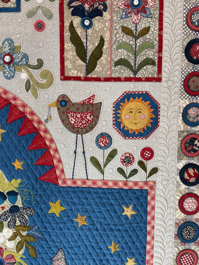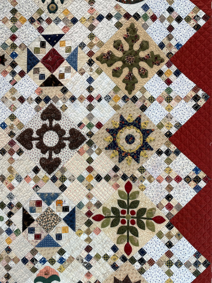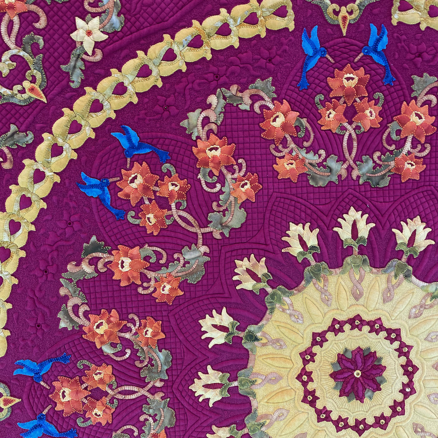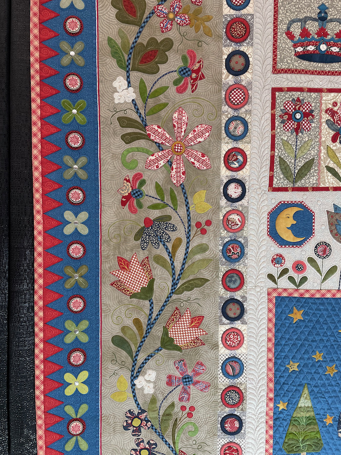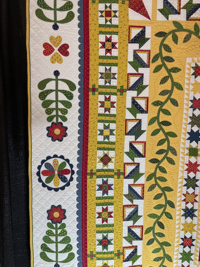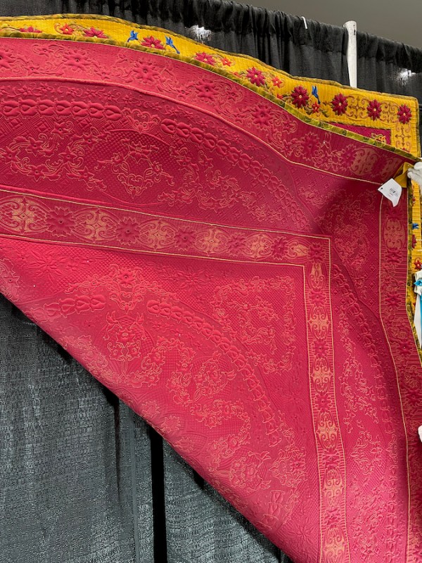 About the colors: from standing there, I would say the color was a slightly blue/red, with red being predominant, but when I got in closer, the camera would convert it to magenta. This was a highly detailed quilt, full of wonderful appliqué.