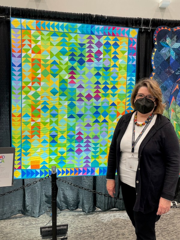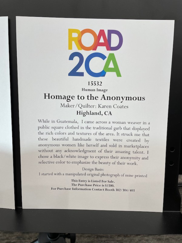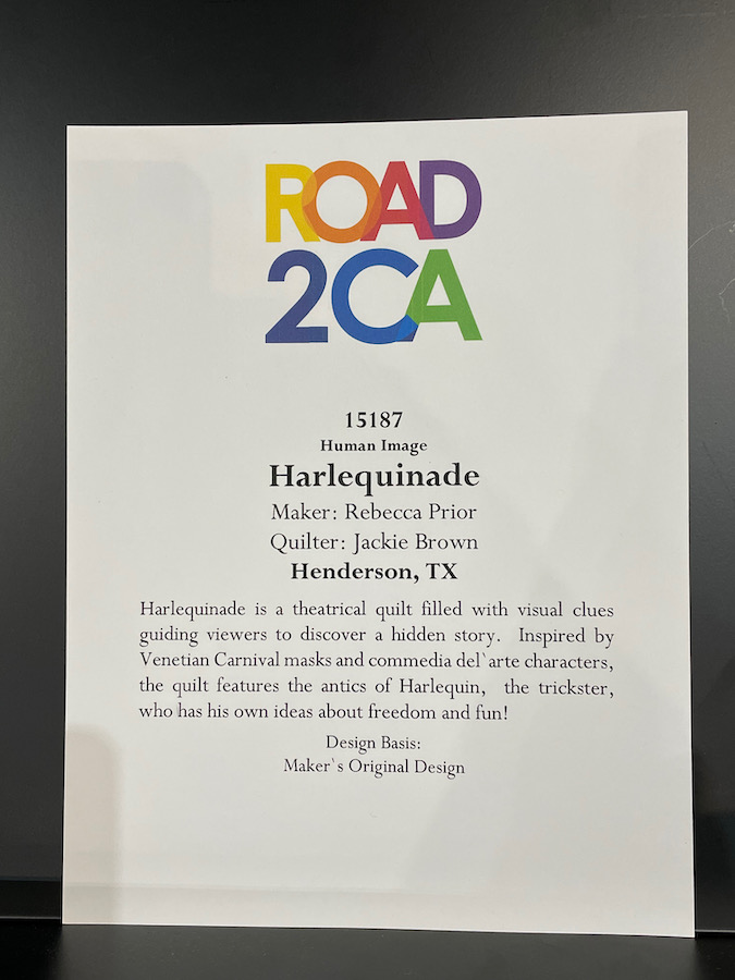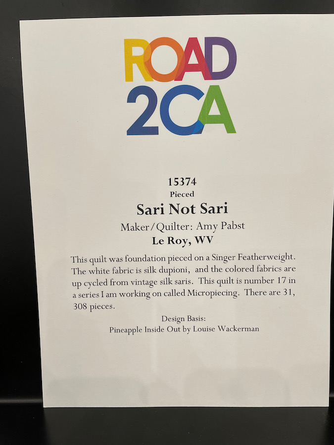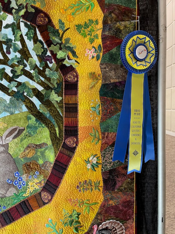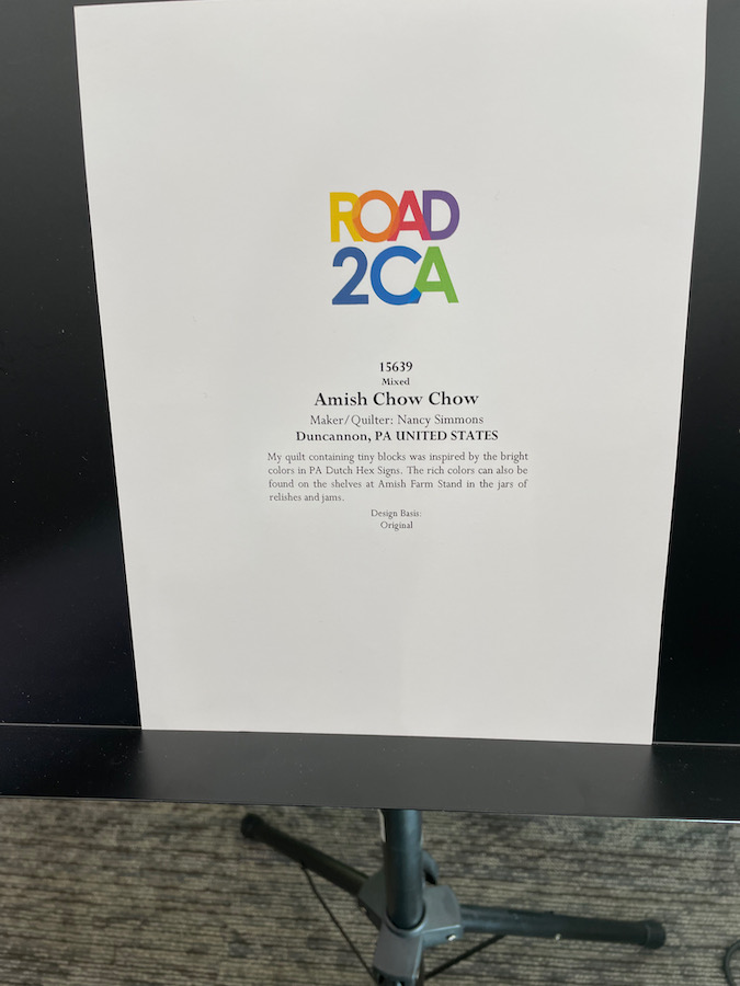 Road to California is a well-established quilt show, running for more than two decades. I have had mostly perfect attendance, ever since moving to Southern California — except for last year, when it was cancelled. Laurel called this year “a year to take a breath” and get your bearings again. When they opened up, we hightailed it to the quilt show area so I could see my quilts. They were still setting up, so the overhead lights were on, a departure from 2020 when I was last here. Everything was so well lighted; we loved it.