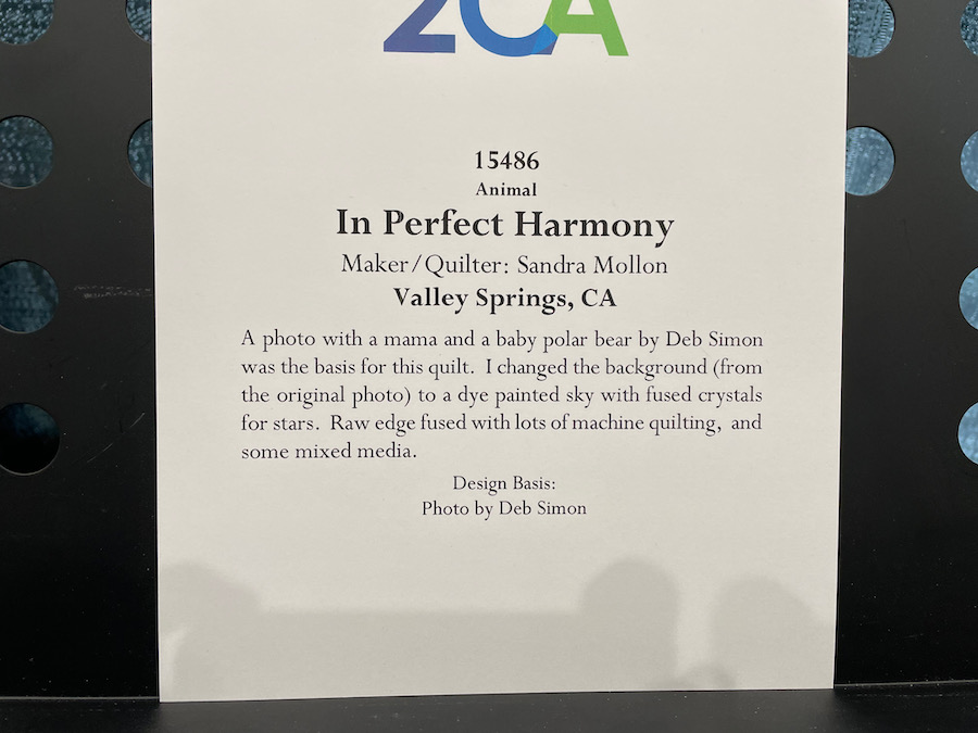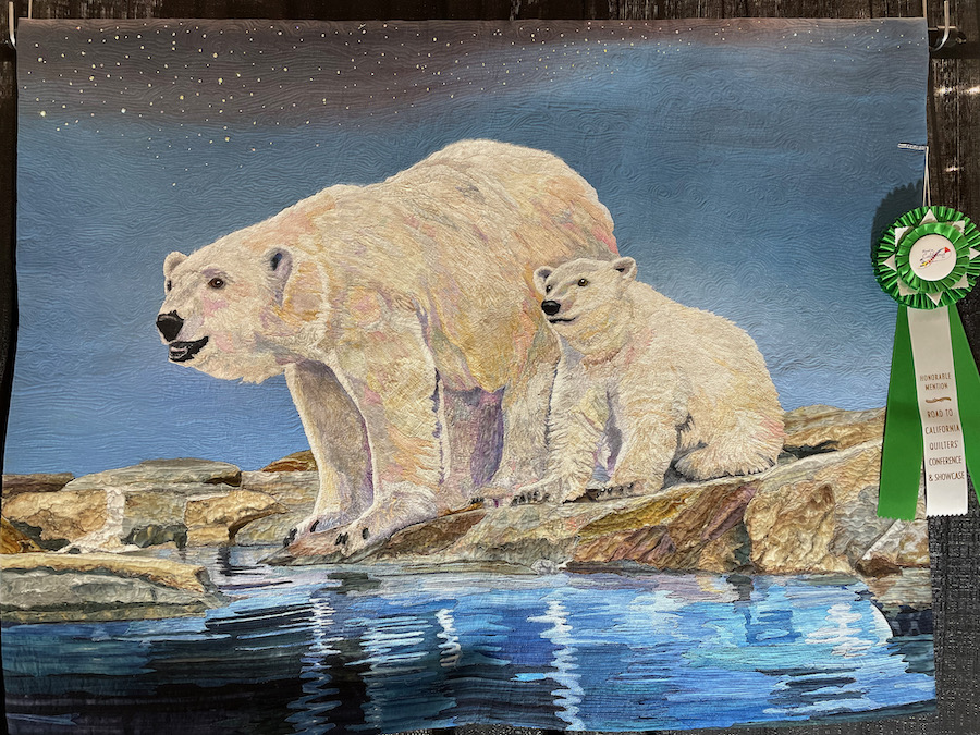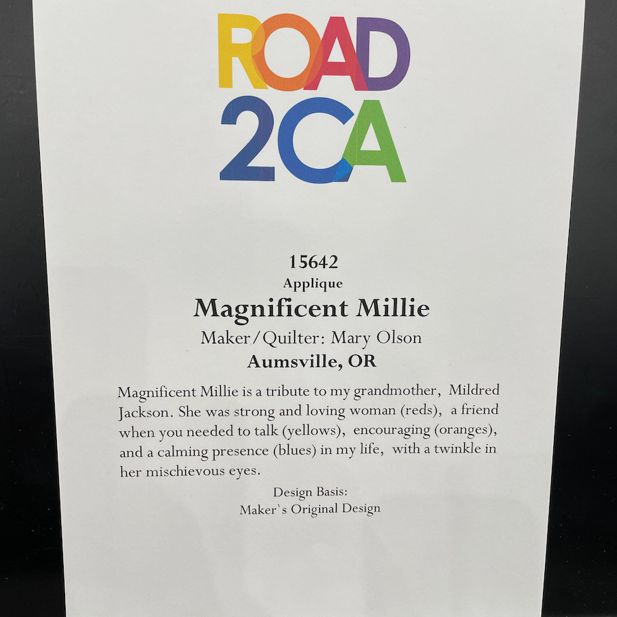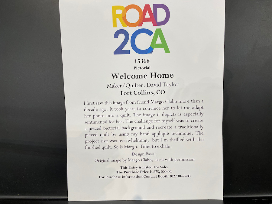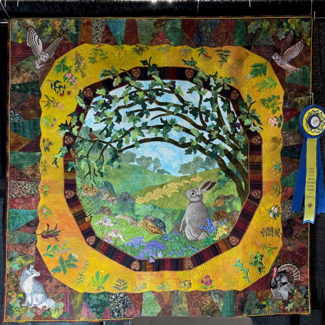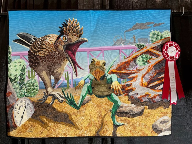 Road to California is a well-established quilt show, running for more than two decades. I have had mostly perfect attendance, ever since moving to Southern California — except for last year, when it was cancelled. Laurel called this year “a year to take a breath” and get your bearings again. When they opened up, we hightailed it to the quilt show area so I could see my quilts. They were still setting up, so the overhead lights were on, a departure from 2020 when I was last here. Everything was so well lighted; we loved it.