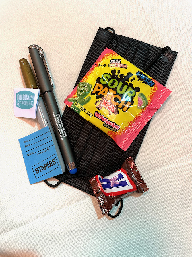 The class was Posh Penelope, taught by Helen and Jenny from Sew Kind of Wonderful — really lovely teachers. At the beginning of class they passed out little goodie kits for us–so welcome! I’d precut and prepped so after the demos, I started right in.