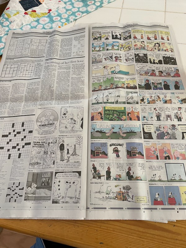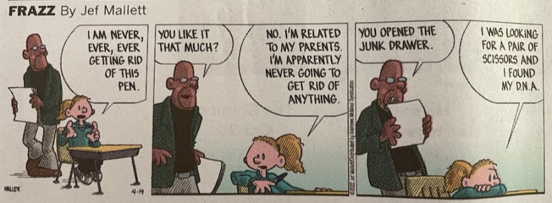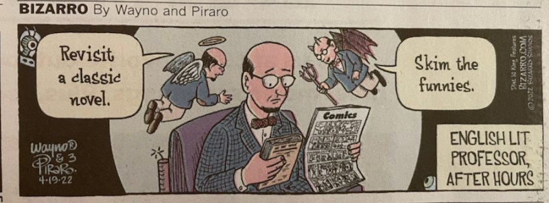 First stop, always: the comics. Then, the advice column, the horoscope. Headlines come next, and then I go through it skimming, catching the tidbits that fall into your lap when you have a paper-paper and there is no algorithm trying to force you into reading what THEY want you to. I read opinion editorials of all stripes, Letters to the Editor, and the regional news (this isn’t our local paper which went off the rails several years ago). This particular morning, I found three comic strips which seemed just for me: