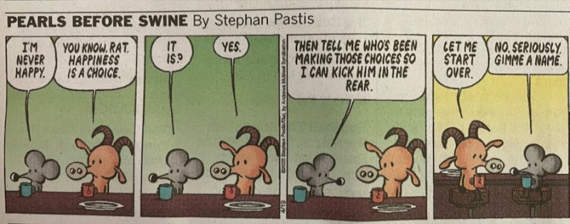And for that last one, I nominate the people who thought it was a good idea to jack up the prices our “introductory offer” to this newspaper of several years ago. We are diehard newspaper supporters, but when we recently did the math, the price over the years had crept up to nearly $800/year (!) for the subscription price. So good-bye to a life-long tradition, planted in us by our parents. I will miss you. (But don’t you love these comics?)