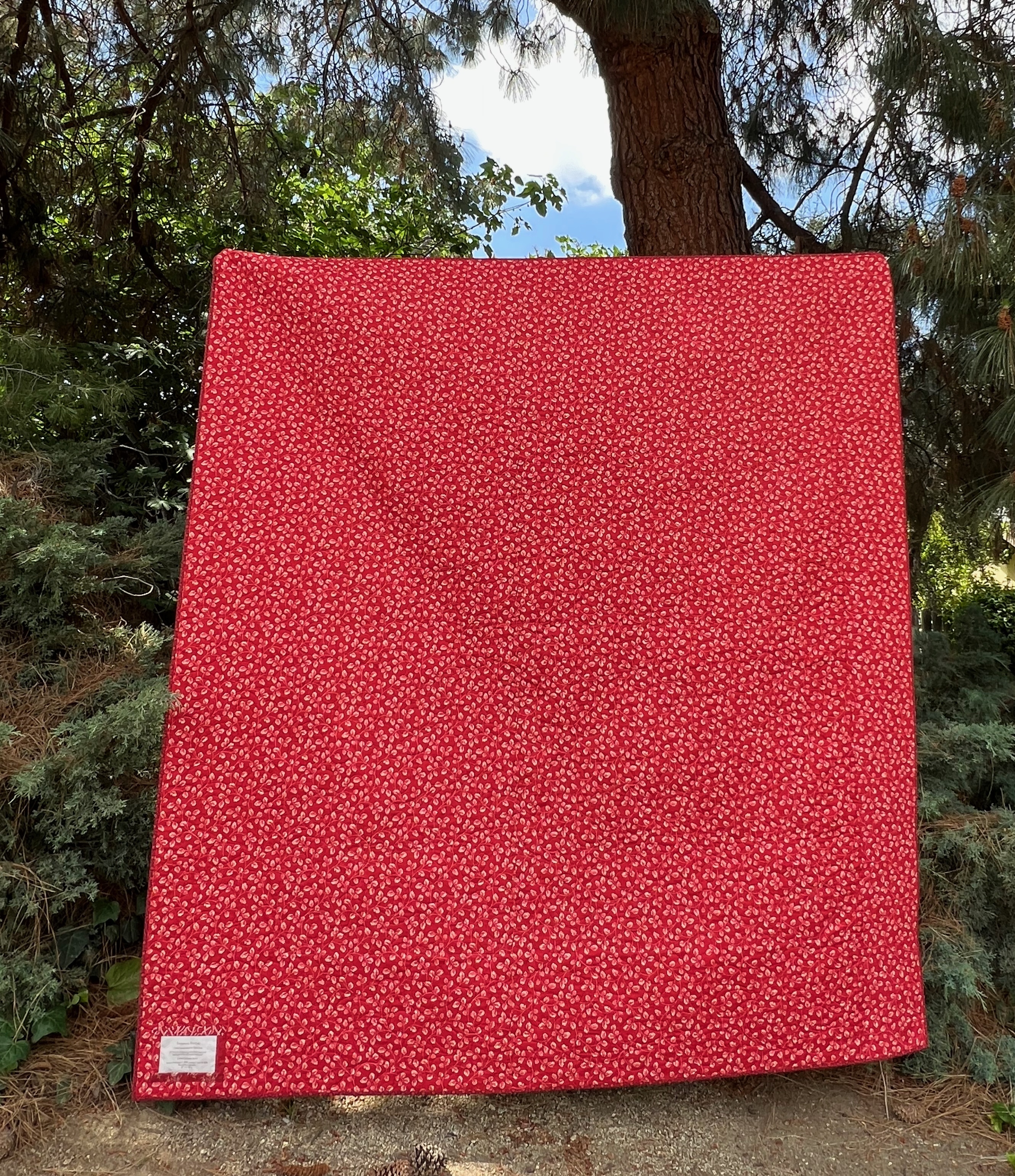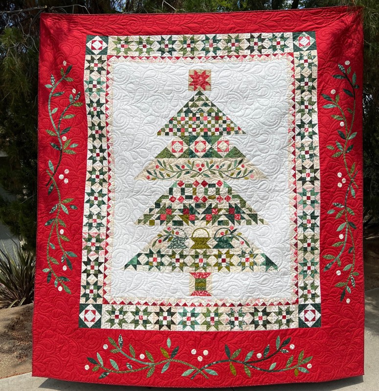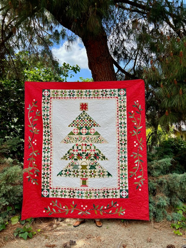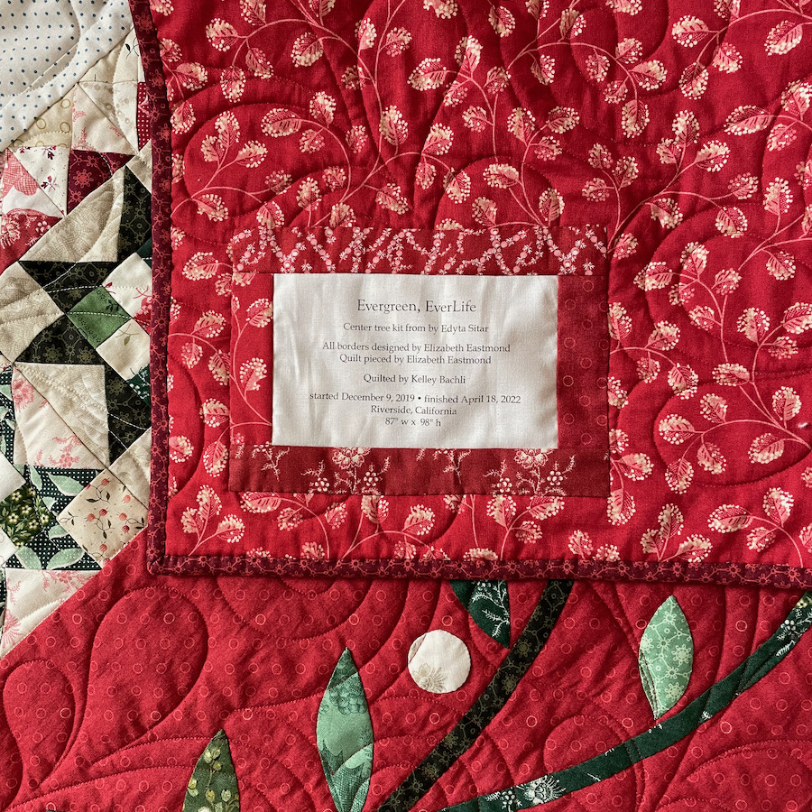 Three outer borders: ric-rac squares, Sawtooth Stars, red with vines were designed and pieced/appliquéd by Elizabeth Eastmond, echoing the central tree. Binding on and finished this past week.