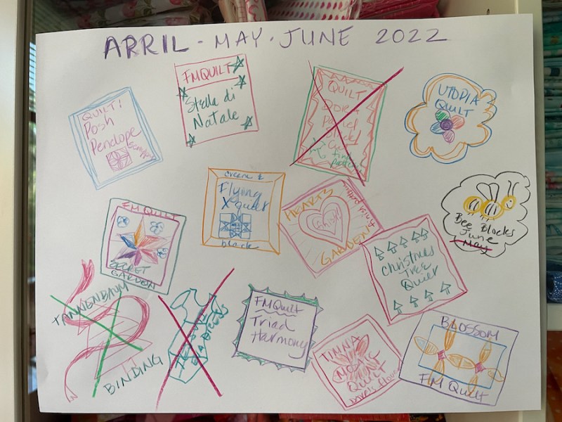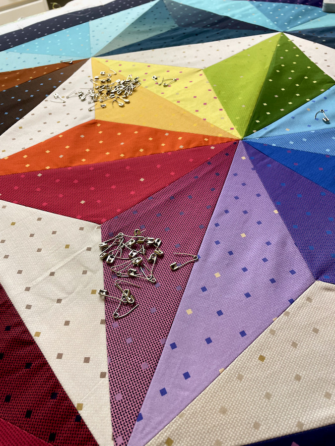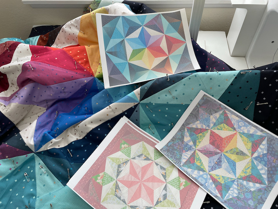 Pinned up Spectral Light, the bigger version of Triad Harmony. The pattern name is Triad Harmony, but you can see I have other versions: one is called Secret Garden (Kaffe fabrics) and one is called Stella di Natale (Christmas, again). I need to quilt them all.