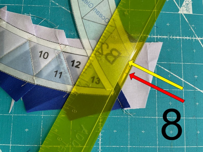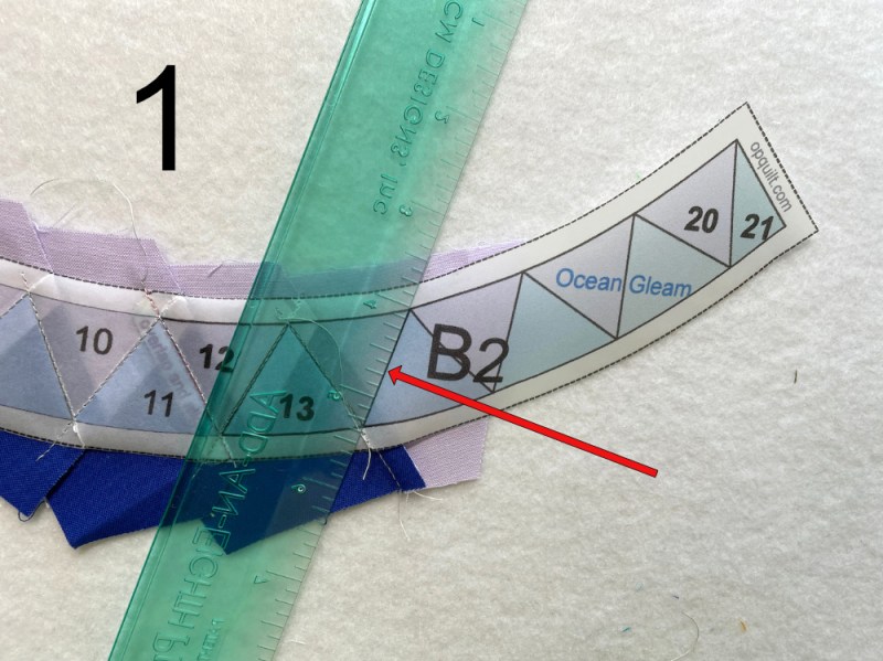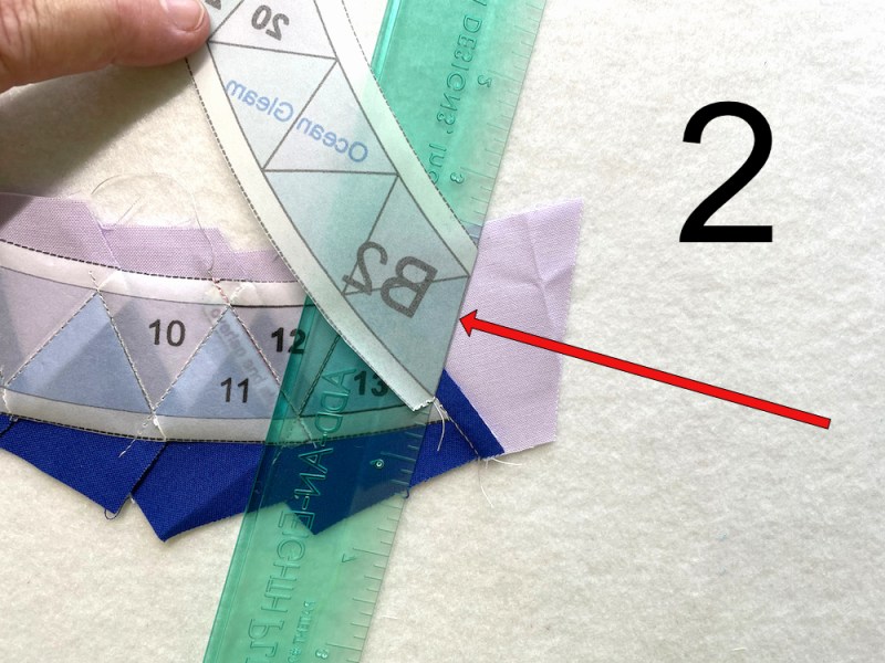 There are two basic rulers used in FPP. One is Add-A-Quarter-Inch and it’s yellow. The other is Add-An-Eighth-Inch and it’s the green one, above. This green one has the sweetest edge, right there by the red arrow. It’s really thin, so it helps in folding (this step). Align that thin edge with the line for the next seam. In this case, we are working on the blue triangle.