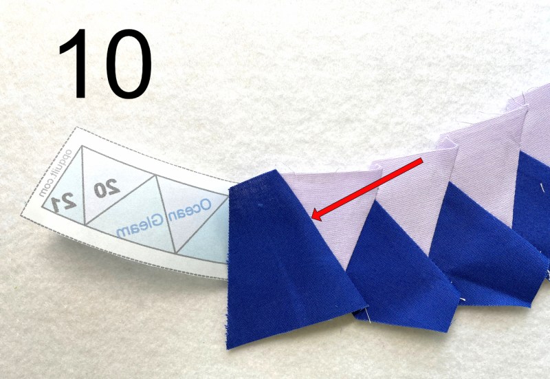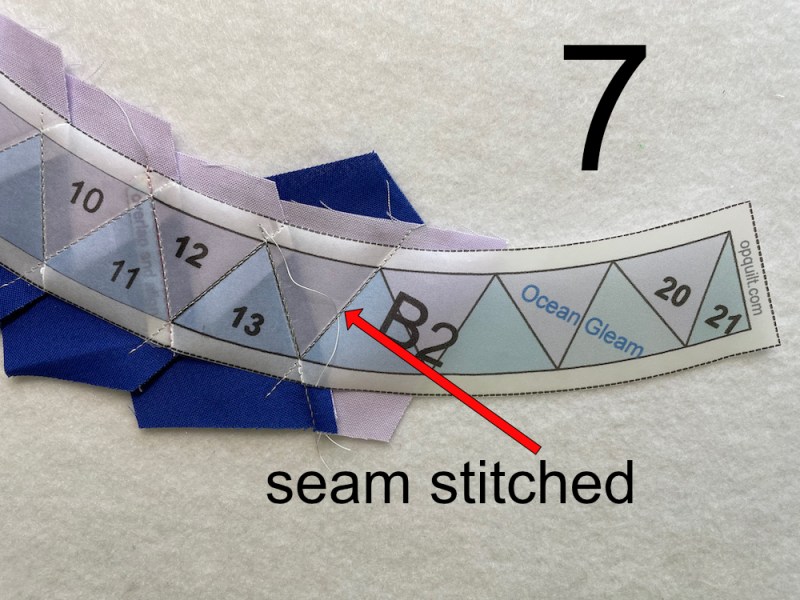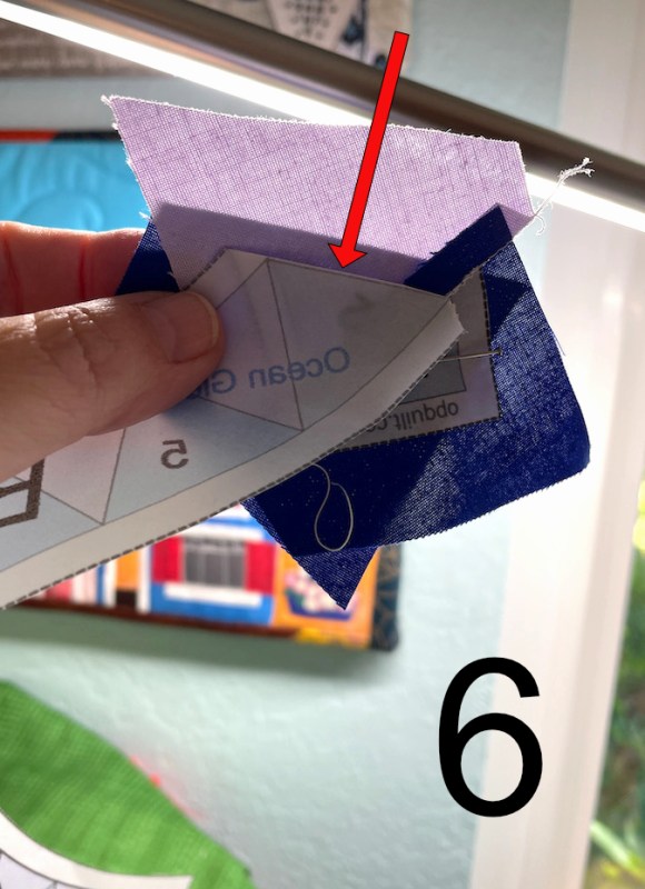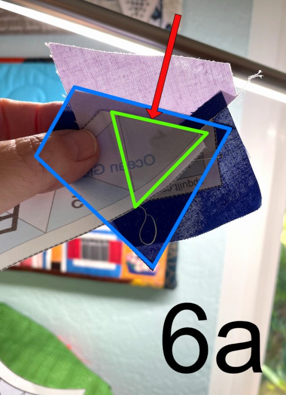Now here, in 6a, You can see the oversized blue triangle piece behind the FPP assembly (marked in blue). I try to line up the side edge about 1/4″ away from where the seamline will be (red arrow). Some people like to trim this edge to 1/4″ before lining it up. I’ve done that. But when I’m working with small bits and am on a roll, it’s another step. Your call.