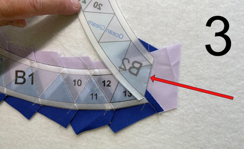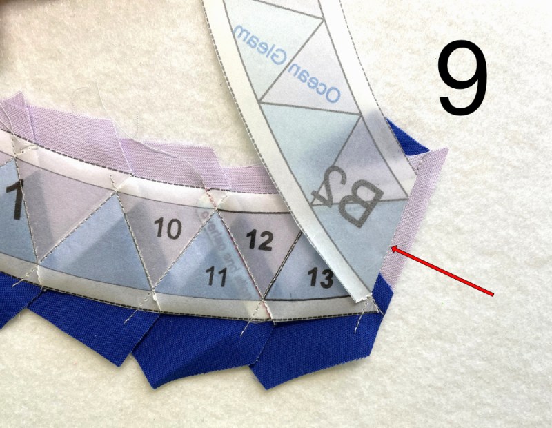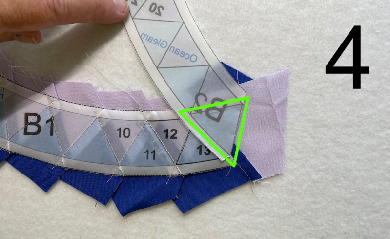 Notice the position of everything: the completed rays are to my left. I work left to right, and concentrate on keeping this oriented this way. Also notice–that triangle marked in green (the blue ray) is what I’m focusing on. If you compare FPP Tip #2 with FPP #4, you can see I’ve brought in a blue fabric triangle and laid it in the approximate position I’ll need to sew that seam (*marked in Tip #3 with a red arrow*).