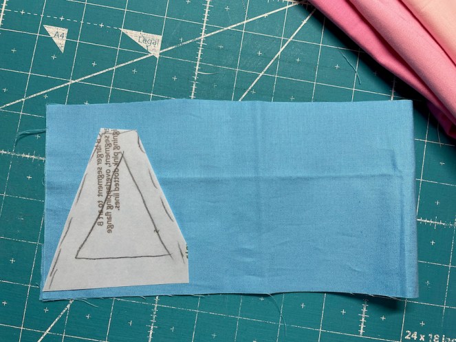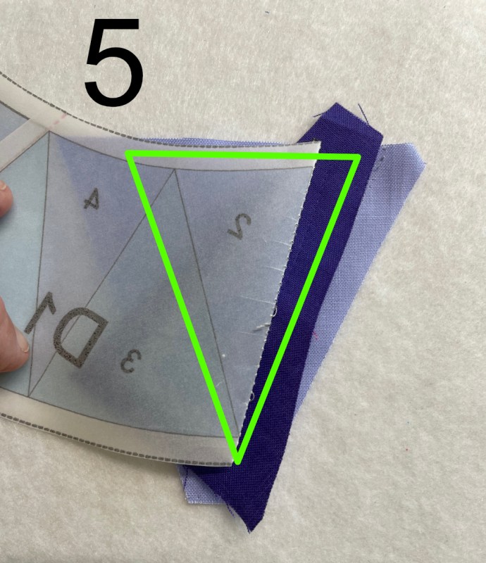 A bigger triangle, same green outline. If you can see behind the deep purple seam allowance, I’ve positioned a lavender piece of fabric, which is cut larger than I need, but in the approximate shape. (Remember how I always trace the ray, but a bit bigger? This is that piece of fabric.)