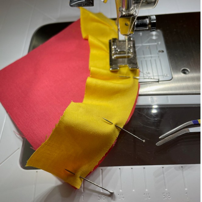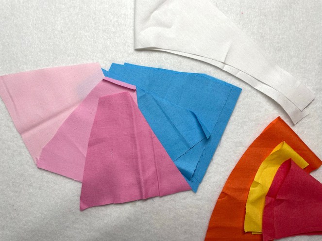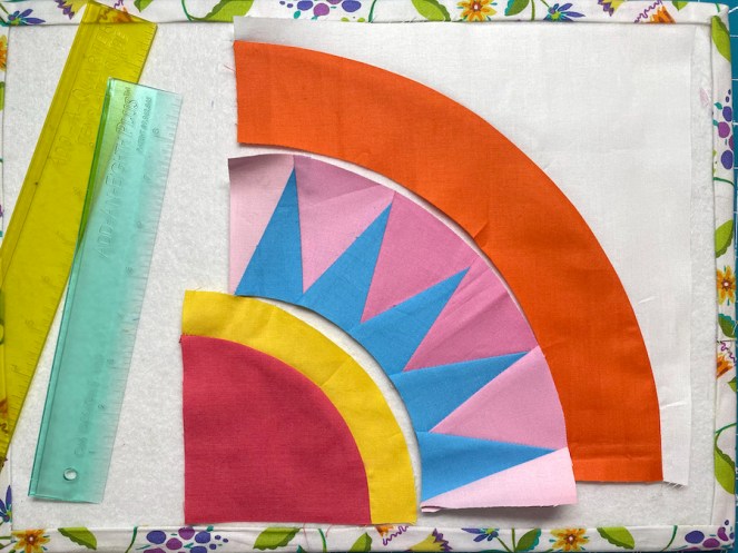 I started from the center, sewing the coral-orangey-red quarter circle to the yellow band. I always press marks at the center, and half-way to the center on both pieces to help with pinning. I have more success with the concave piece on top, and the convex piece on the bottom.