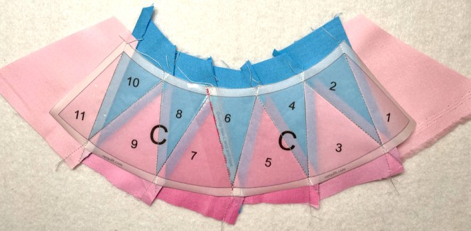 In the top photo, you can see my press marks to help in sewing the arcs evenly onto the matching convex surfaces.