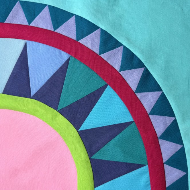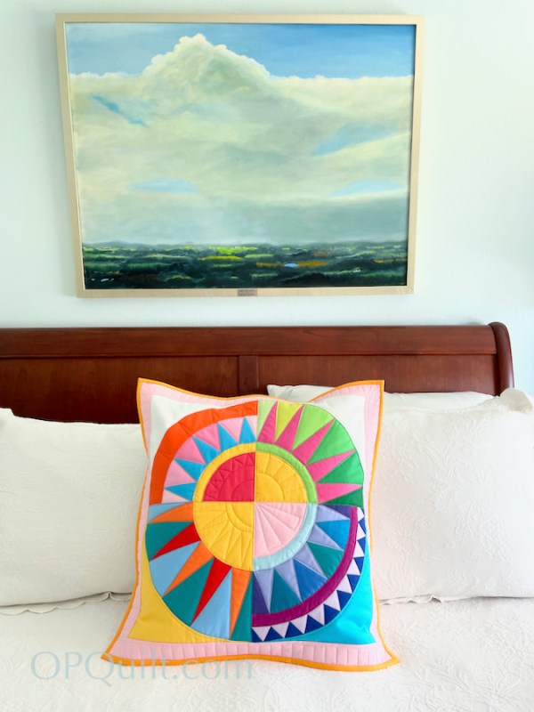 Oh, the fact that the triangles create hearts in this last block is a lovely treat. Indeed they are created and shared with a lot of love. Such a fitting way to finish this out. The pillow is so bright and happy!