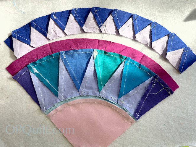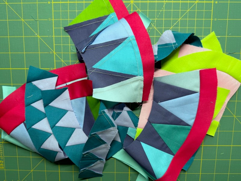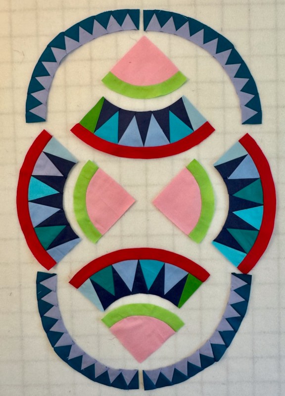 Yes. I am trying out colors again, but I have committed and am starting, judging by the sewn triangles on the upper arc. (The lower arc’s pieces are just laid out.)