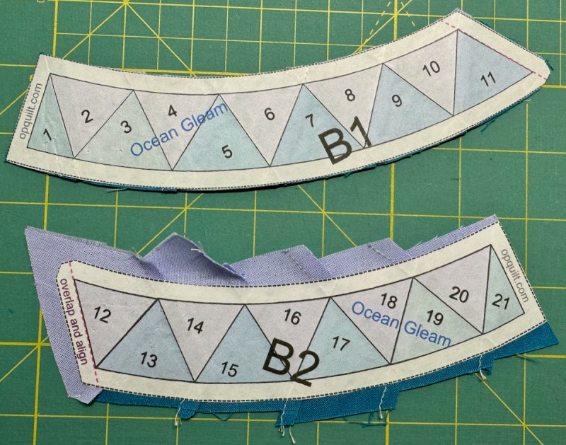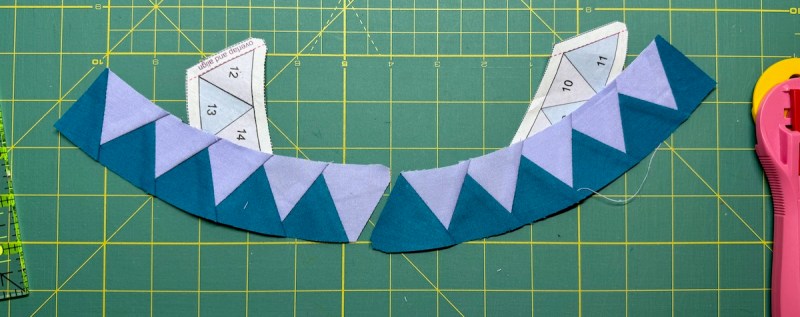 Do you remember in the last post that I told you I figured out I didn’t need the paper on everything? It came from sewing this together. First I ripped off the seam allowances, like I’d learned. I was still wrestling with it under the needle, so I started ripping off the paper on the triangles. This photo was taken when I stopped to rip ALL the paper off. I had already pinned my four marked intervals together, so I didn’t need the paper for that.