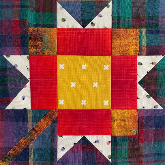 And like a good girl in QuiltLand, in that earlier post I also give you its heritage, and how I morphed it a bit. In the above block, I am following the Roberta Horton Rules for plaids: it’s okay if they are slightly off-grain, as that gives the block more motion.