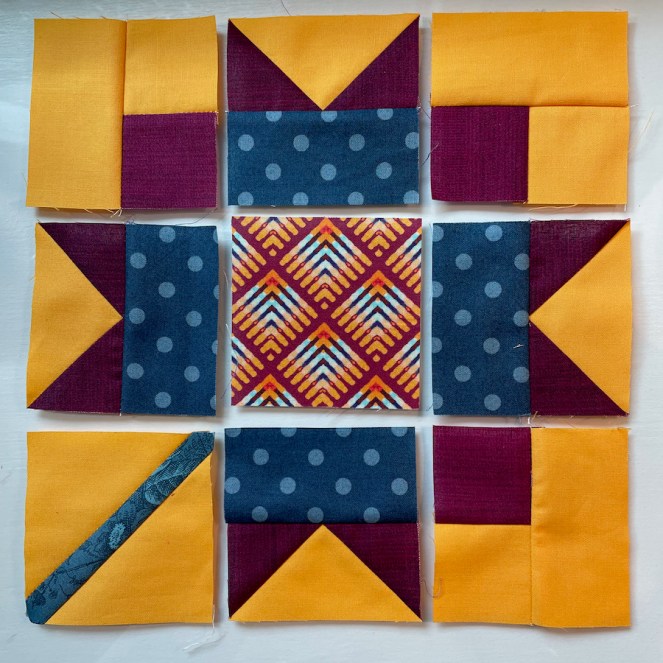 My month for choosing a block for the Gridster Bee is July 2022. I’ve been in love with this block for ages, even way back to the Flickr times, when I saw it on someone’s photo stream where they had done it for their Bee Block, too. Here it is on an earlier Instagram (when we all liked IG). Their blocks were Halloween oriented, but I have quite enough Halloween quilts.