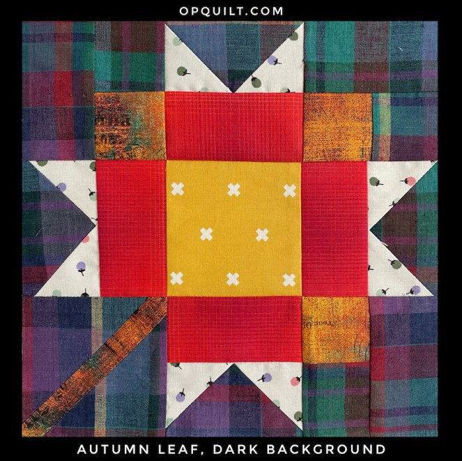 For a signature block, I slipped a little leaf FPP block into the pattern; please make it in either size: 4-inch or 6-inch. Again, please use the fall colors and sign only what’s seen: name, IG handle, city/state.