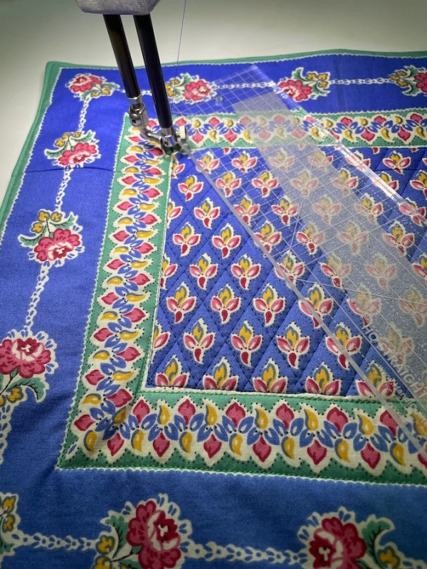 I glued down the fold, stitched it, backed it with some batting and more impossibly old fabric, turned it inside out, poked out the corners and stitched the opening closed. I went on an adventure with quilting, moving from WhatWasIThinking to ILikeThisPrettyWell.