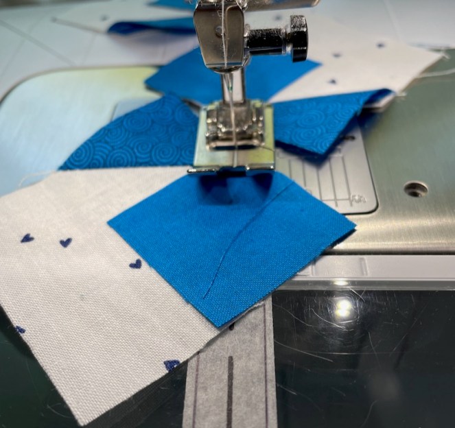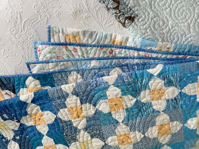 Jen’s quilting, using the E2E pattern Funky Fans really complimented the repetitive nature of this quilt. I think of this as a calming quilt. I have another blue quilt, also quilted in a repeated curving design, also calming. Here they are talking together: