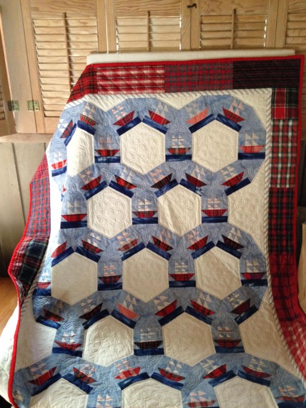 I love your Jack’s Chain, and thanks for posting my quilt with the sailing ships. (I’m sorry I didn’t have a better photo.). The quilt was not made for a child, but for a 1999 South Bay Quilters Guild challenge: to make a quilt using the guild’s logo, which is the traditional Mayflower Block. It’s not that exciting a block, so I found a fun way to set it. I drafted my own pattern from a little sketch in a quilt-block book.