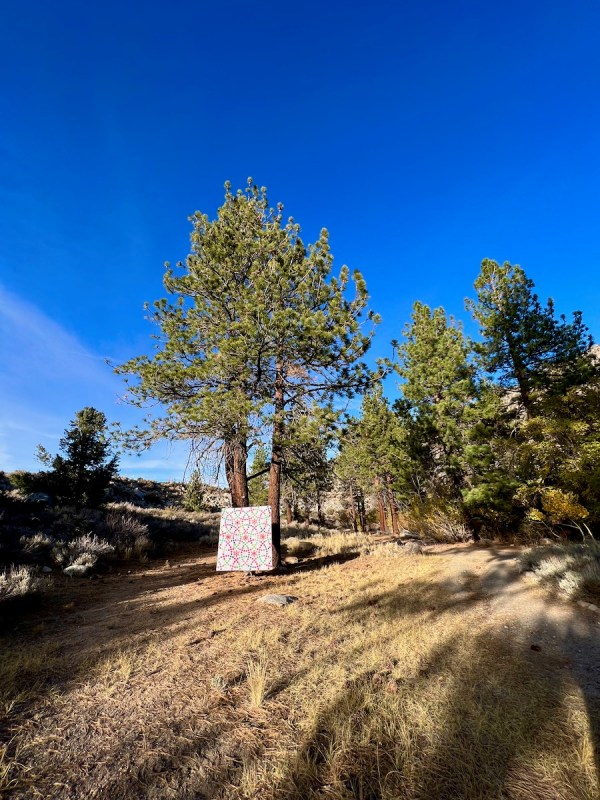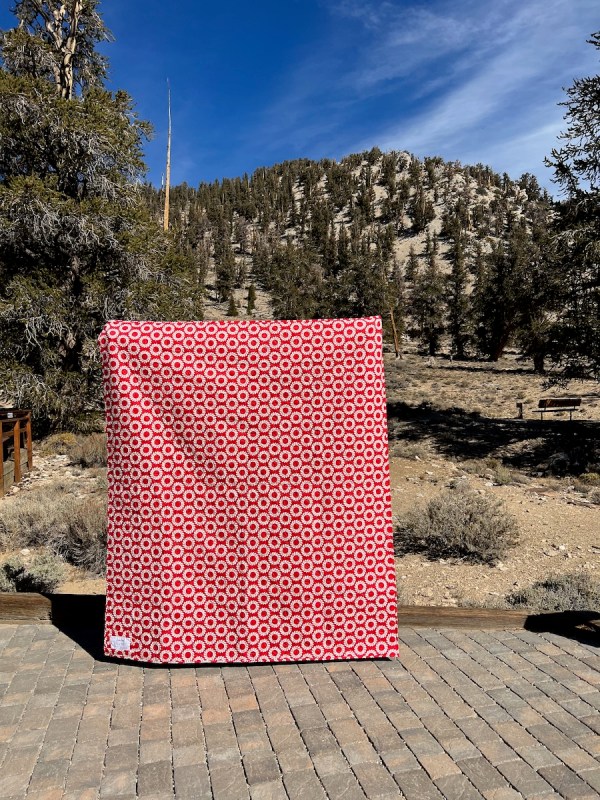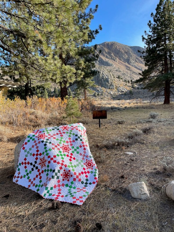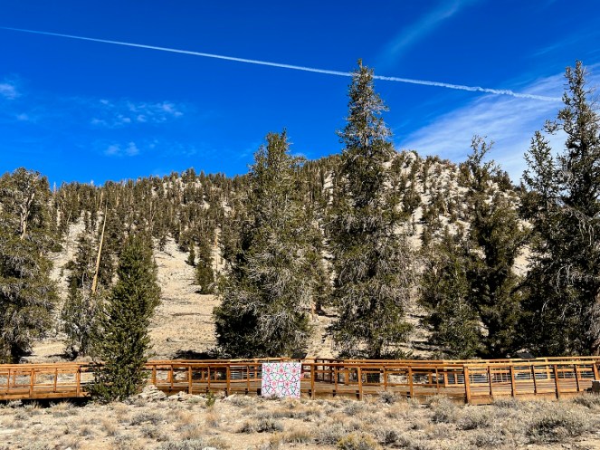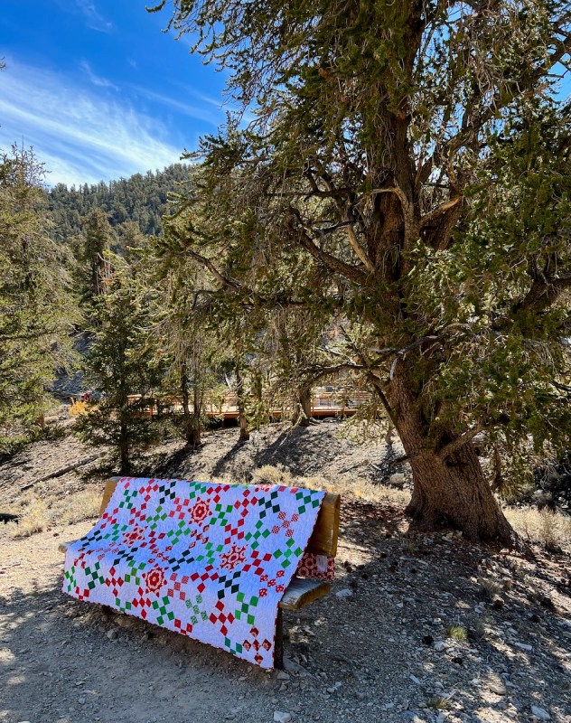 We recently took a small road trip up to see the Bristlecone Pines in the White Mountains. Pine trees = Christmas, right? And while we were up there at 10,000 feet at the Ancient Bristlecone Pine Forest Visitor Center at Schulman Grove, we took some pictures with those old pines of my latest Christmas quilt, Jingle Bells.