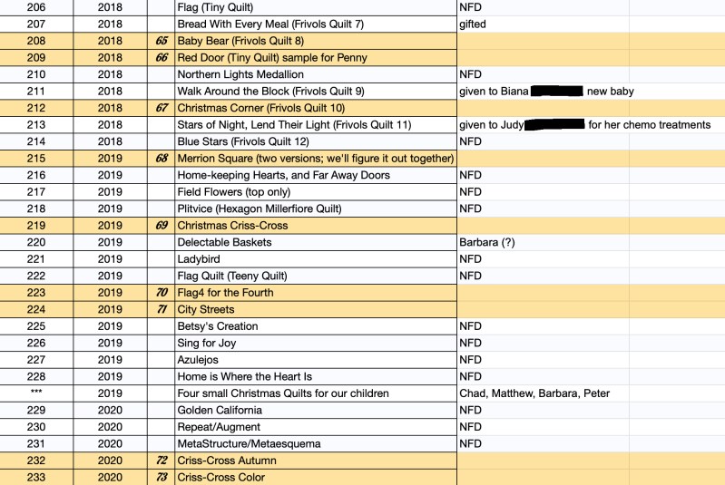 9. I know how hard it is to come across a mother’s belongings and deal with them. Allow everyone a few keepsakes, for sure. As for quilts, I try to give mine away as I go. I have a very out-of-date spreadsheet like yours. though I always track quilt dimensions too. I’ve learned that showing family a photo only, without a reference for size, isn’t enough information when they want a bed-sized quilt. I do not want to inventory my quilts (again), but I know I have too many NFDs… the ones that have hundreds of hours of work, and that I think won’t be appreciated. Ha! I’ll let others not appreciate them after I’m gone! Best wishes with your efforts. That’s a big task.
