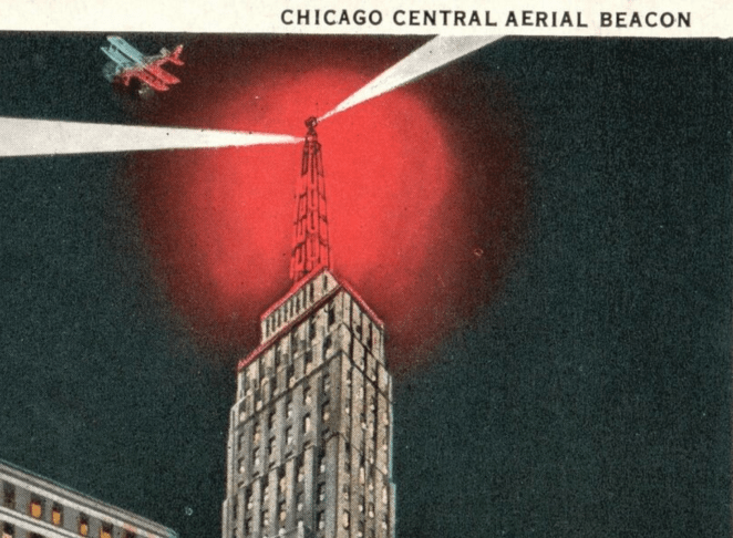 Many aerial beacons were atop tall city buildings. This is from a vintage postcard of Chicago.
