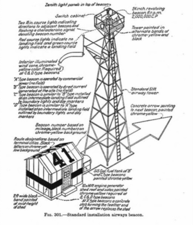 Some aerial beacon were little huts with a number painted on the roof. They were next to the tall beacon, with a concrete arrow pointing on to the next one. These are still found in the United States on hilltops, beside cities, although there are very few extant arrows.