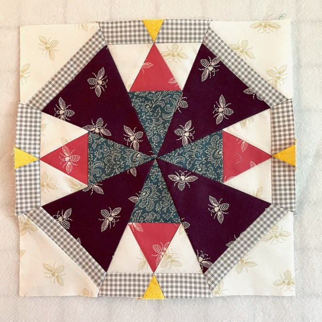 A traditional block, which would let the bees show off nicely, as well as the coordinating fabrics. I loved those four big triangles; sort of like propeller blades (another reference to flight). So I made my first block, wondering if could I even do this? I chose to make this a foundation paper-pieced block, so as to get those snappy points and to keep everything in place (pattern coming next year some time).