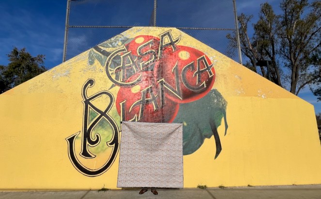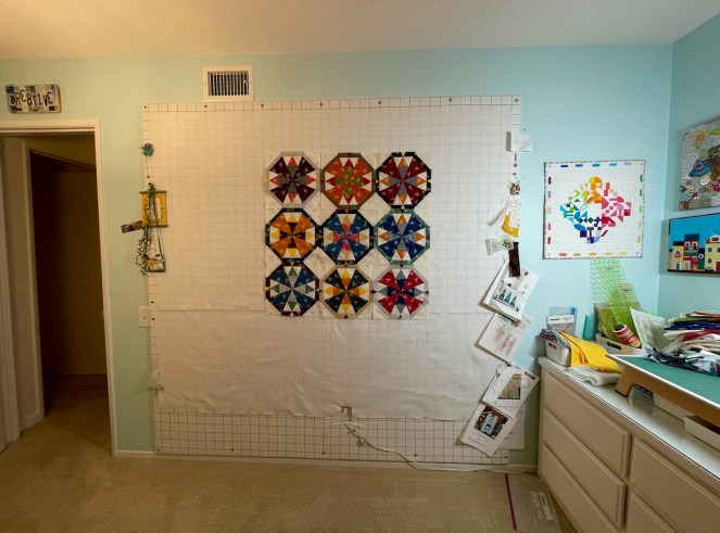 I did begin making the blocks way back in October, first thinking about a design with nine blocks. But there was so much fabric left from each French bee color, that I made more. And took trips to Utah. And tried to sew. And took trips to Utah. And I kept trying to write the pattern, because it was such a fun block. And took a final trip to Utah. Then unlike those early pilots ferrying mail, in the next few weeks I felt more than once like I had lost my way. This quilt spent a lot of time wadded up in the corner, as I just didn’t have the moxie to work on it.