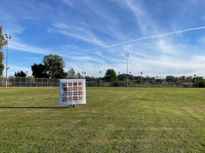 the back of the quilt, held by the best Quilt-Holding Husband, at a local park