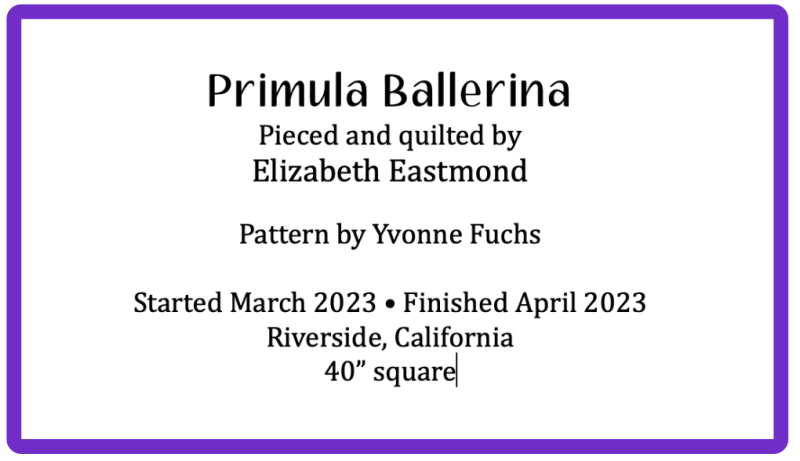I quilted it on my Sweet Sixteen Handiquilter; this size is a fun amount of quilting for one SoCal quilter (me). Label mock-up: