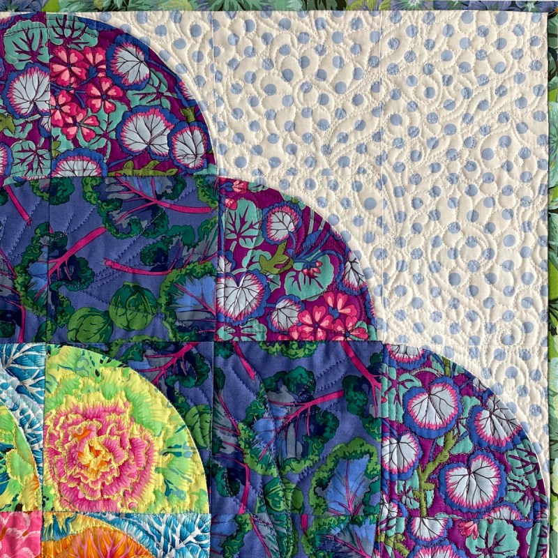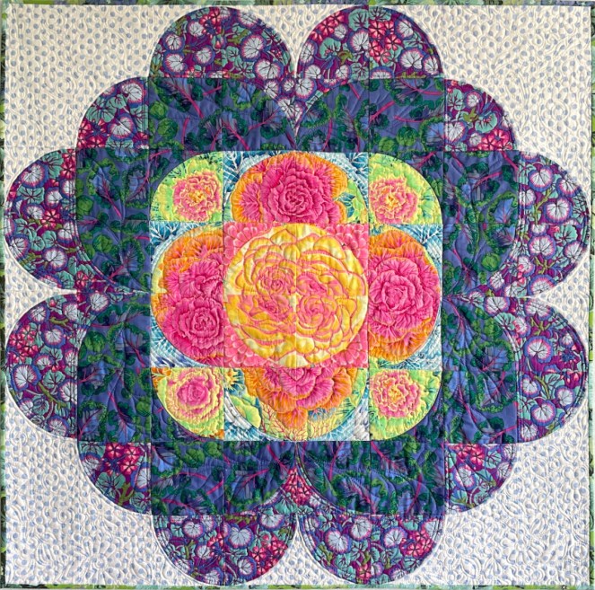 A hymn sung in our church begins with “Earth, with her ten-thousand flowers” and ends with the sentiment that all these things of nature “Have one chorus: God is love.” This was reinforced to me when I went hunting for a title for this quilt (not wanting to borrow from the original pattern — more info here), and fell down into a fun rabbit hole of internet blossoms.