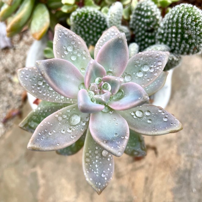 These strange looking almost-flowering buds belong to the Mother of Pearl plant. It’s also known as the Ghost plant, or Graptopetalum paraguayense.