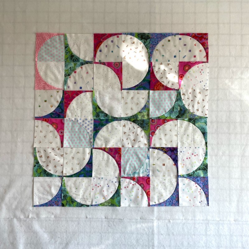 And then this happened. It was the arc scraps from Primula Ballerina’s Drunkard’s Path blocks, filled in with low-volume fabrics. I blocked all out that was happening below me in the kitchen and kept going because I was listening to this: