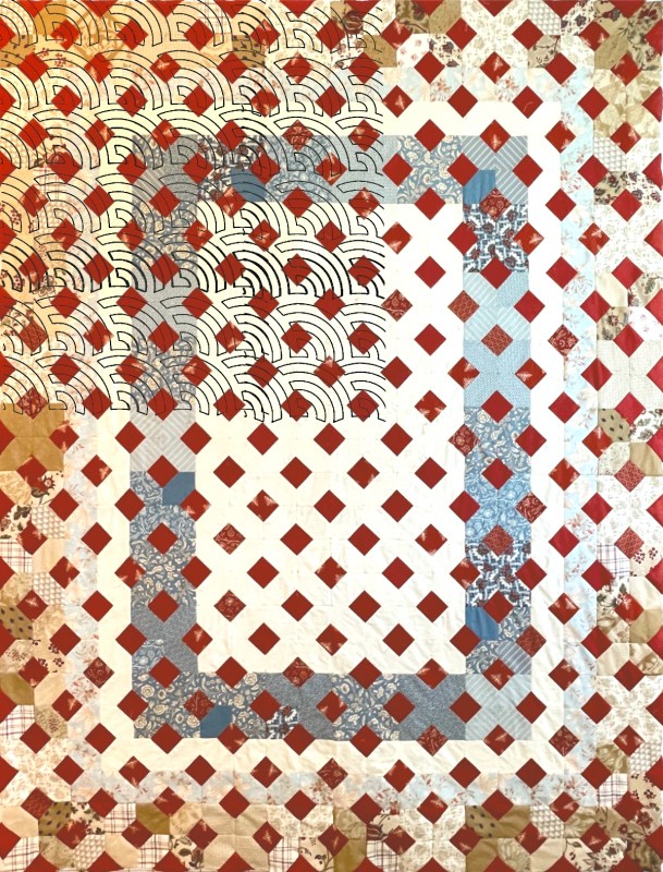 I decided to sew on a border as the edges were as unstable as my current state; on the right is my mock-up of the quilting for Jen, my long armer.