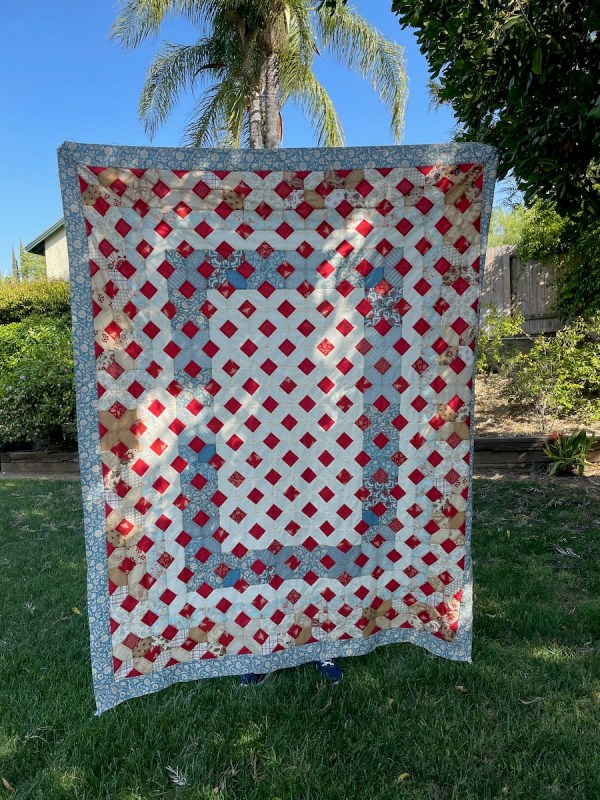 And then when the construction drapes were cleared from the family room for a weekend, we took the chance to binge-watch the last season of Sanditon. The ending(s) reminded me of Lord of the Rings, when we had wrap-up ending, after wrap-up ending, after wrap-up ending. Which allowed me to do a wrap-up ending on this EPP quilt (North Country Quilt) which was started in April 2019. (Free pattern for the pieces at the link.)