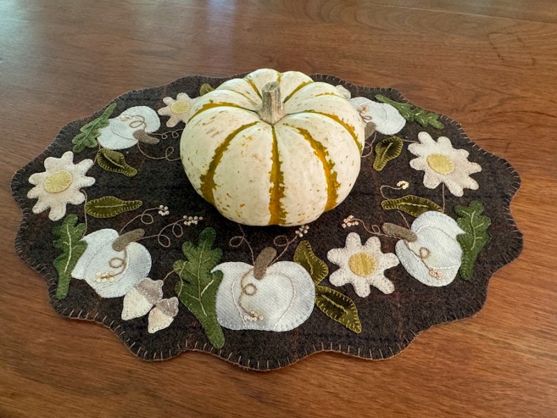 Lastly (finally!! She’s at “lastly!”) while I didn’t turn on my sewing machine for nearly three weeks, I did sew a stitch. I finished this little wool mat filled with pumpkins and all sorts of twiny-viney lines of stem stitching, which I can finally say I’ve mastered. I purchased this for a friend who was going through stem cell treatments, but her eyes took a turn and she couldn’t see very well until she got new glasses. (She is working on the larger one I already gave her.) So I kept it back, then lost it, then found it again, and decided it would make a nice doo-dah for our table.