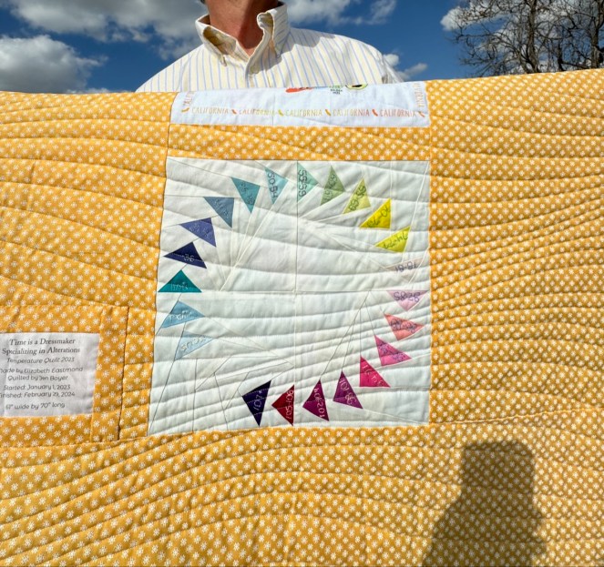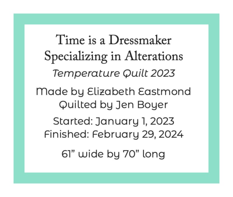 6. It’s another lovely temperature quilt, Elizabeth, and I’m very impressed with the timeliness of your finish. It would take at least 18 months for me to make a quilt like that! Your thoughts about marking time, and time marking us, are profound and apopos. I guess I spend my time “being,” not marking much of anything except the highly visible, and increasing number of gray hairs on my head!
