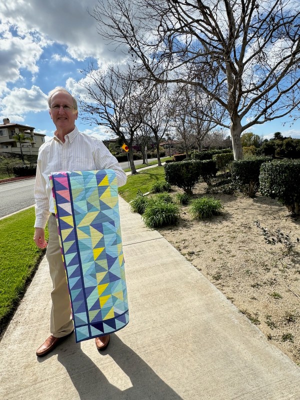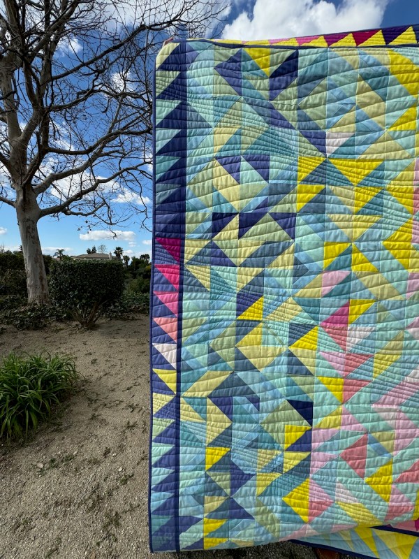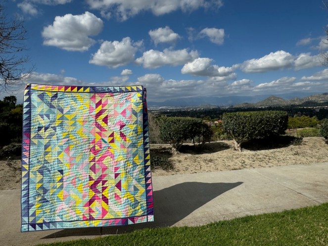 No surprise that I chose this title for this quilt, as these patchwork triangles mark the passage of time, and by their very color, alter the face of the quilt top. I’m not sure I’m as generous about the marks time has placed on my physical body, and sometimes the alterations of who I think I am can sometimes be pleasant, and other times, painful. I want just enough spice and change in my life to make it interesting, but I don’t want sustaining relationships to wither or change or wilt. Some you can’t get back, like when my father died earlier this year. Other relationships take a bit more stitching and cutting and late-night sewing to become the beautiful garment (or quilt) they were meant to be. Y’all know what I mean, and I’m guessing the marks time leaves on all of us can be wearying. Or gratifying. Or somewhere in between.