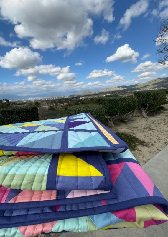 While I didn’t want to replace the earlier version, I did love love that quilting. Jen was able to do the same pattern on this quilt, too. It’s more square, has a temperature quilt key on the back, along with a linen tea-towel calendar to show the year. I also added a square denoting made in California. Which it was.