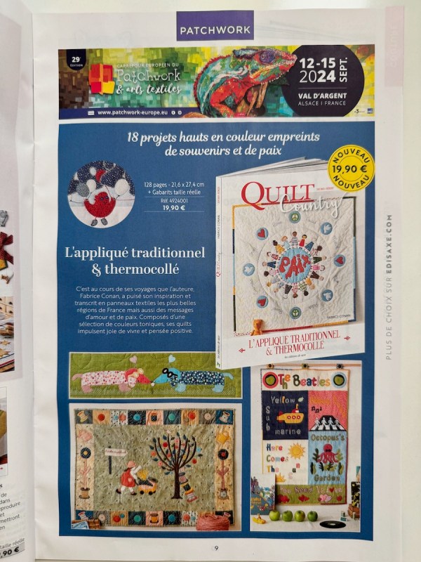 The book was written by a Japanese quilter, but published in French. I looked for any magazines that might replace our beloved QuiltMania magazines, and there were some, but alas — not any in English.