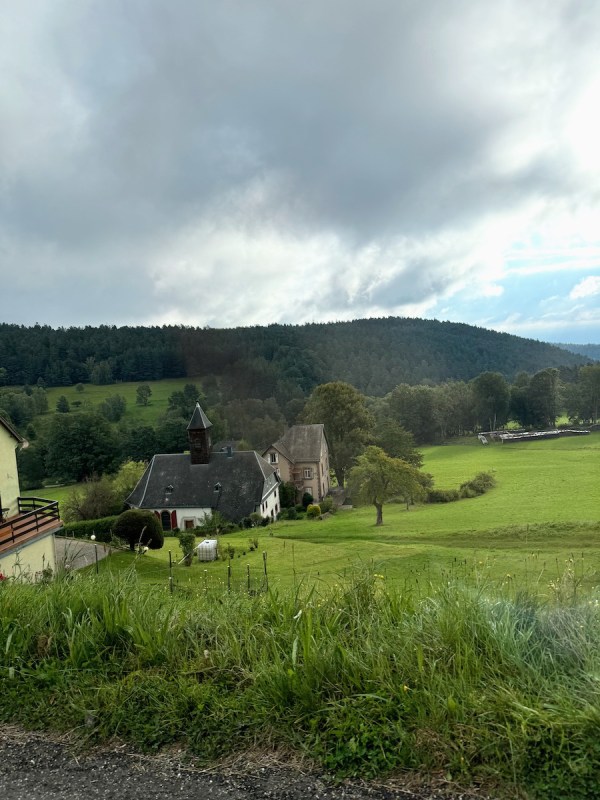 Saint-Marie-Aux-Mines (yes, this area is also known as the Valley of Silver, where there were a lot of mines) was about 35 minutes away through lush green hills…which turned into 45 minutes away because a road had washed out and we had to take a detour. Luckily we were following someone, who we rightly guessed was going the same place as we were, so we didn’t get (too) lost. Parking was good, and close by.