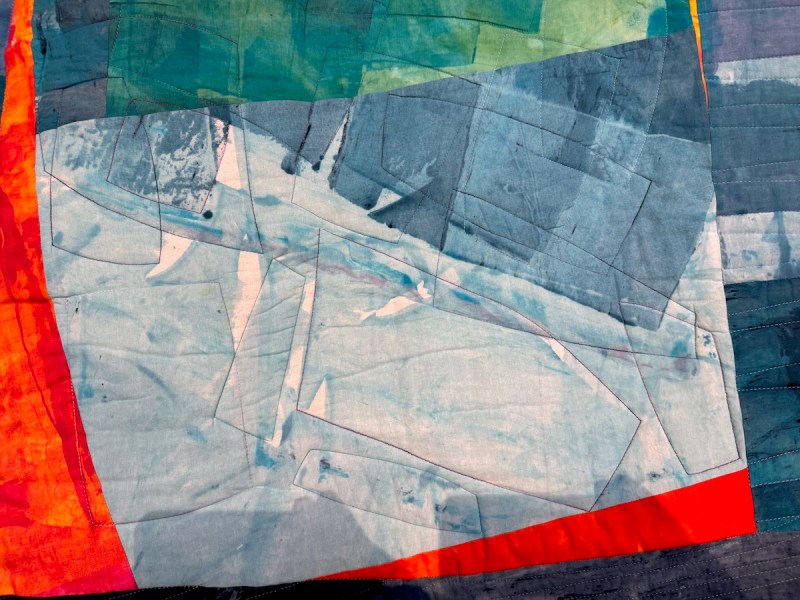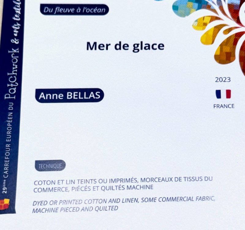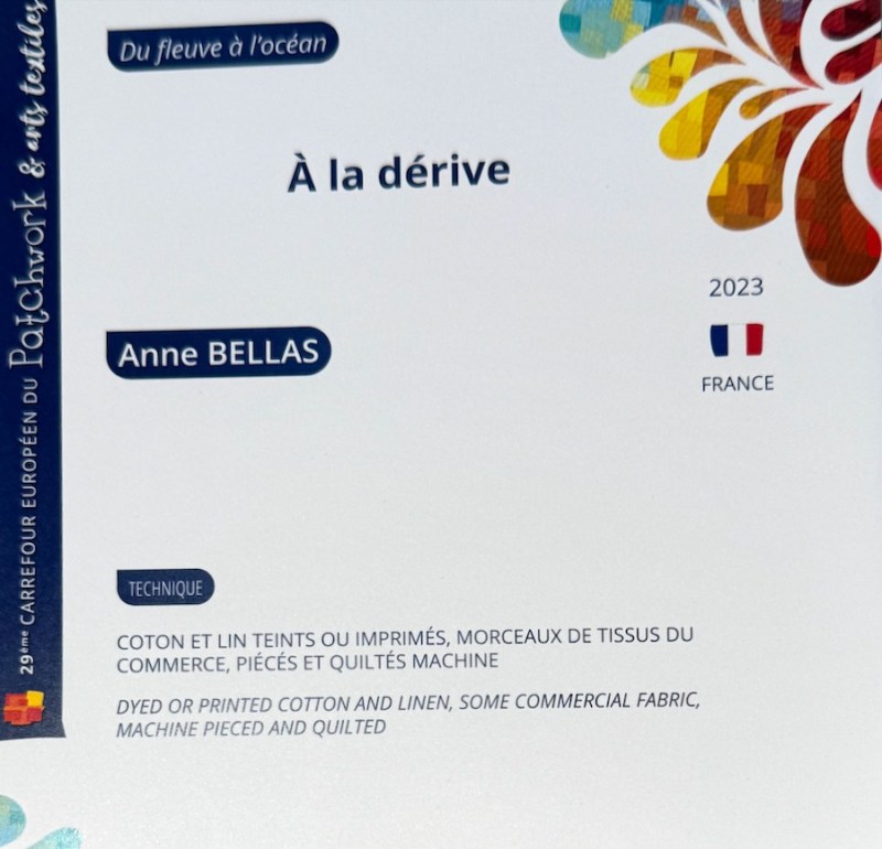 “After living for a long time on the Atlantic coast, and now residing in Nantes on the banks of the Loire, Anne is obviously sensitive to the theme of the ocean and water in all its natural forms: coastlines and estuaries, rivers and lakes, stormy or dry seas, ice floes and storms are words that her imagination tries to recreate. For this series, on which she’s working…her sister Cécile, a budding writer, came up with a short text to accompany each of the works, developing the emotions and memories they evoke for her” (from Carrefour European Patchwork program, 29th edition).