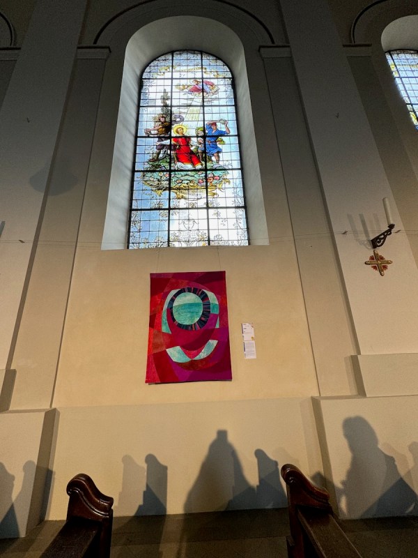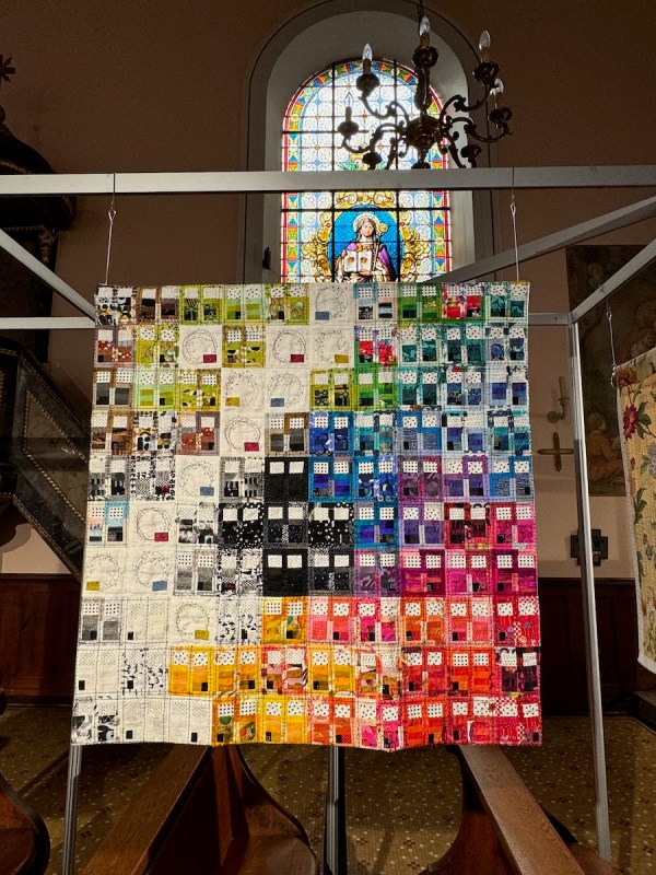 It’s a challenge to light these older churches for quilt exhibits, and I give all kinds of credit to Carrefour European Patchwork Show for the bunches of light they bring in (you can see the scaffolding in the two photos, above — a long rail at the edge of the benches with lights aimed at the quilts). So I’ve tried to adjust the photos on this end, at the computer, to compensate as well.