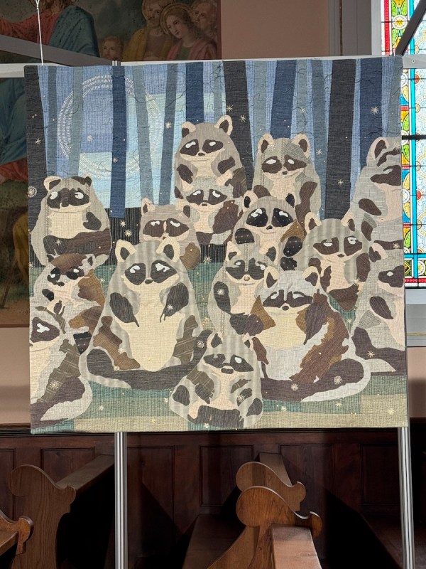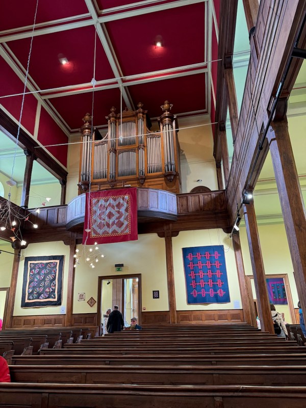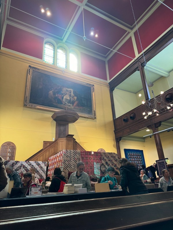 I love the Saint peeking out overhead, watching over us quilters. Really, old churches and quilts might possible have a natural affinity one for another.