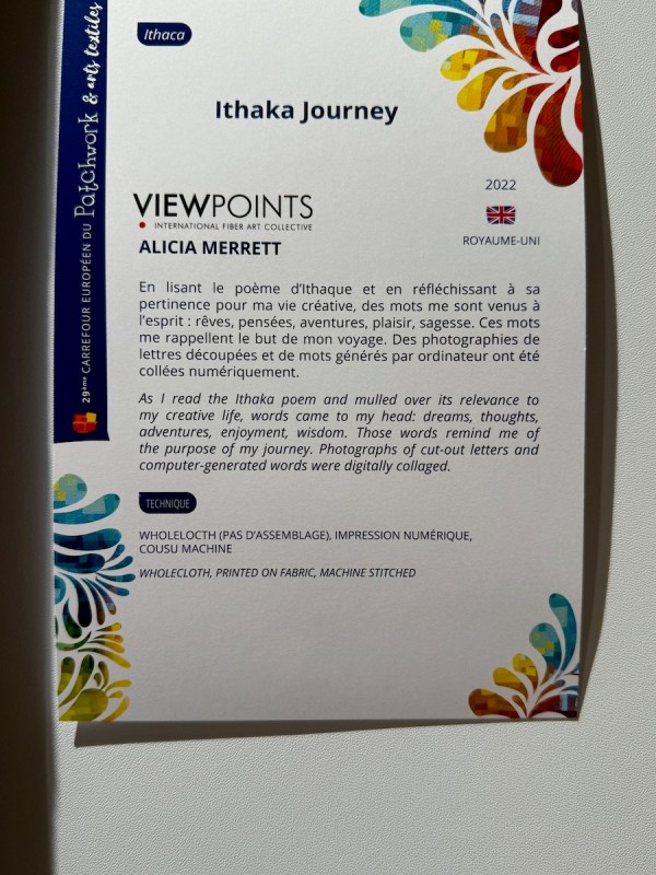 This is where — several weeks later — you really hope you got the right title card with the right quilt. On these two, I don’t really know. (Click on any in the galleries to enlarge.) I did head to Hsin-Chen’s website and she does have a bit about Ithaka, so my fingers are crossed.