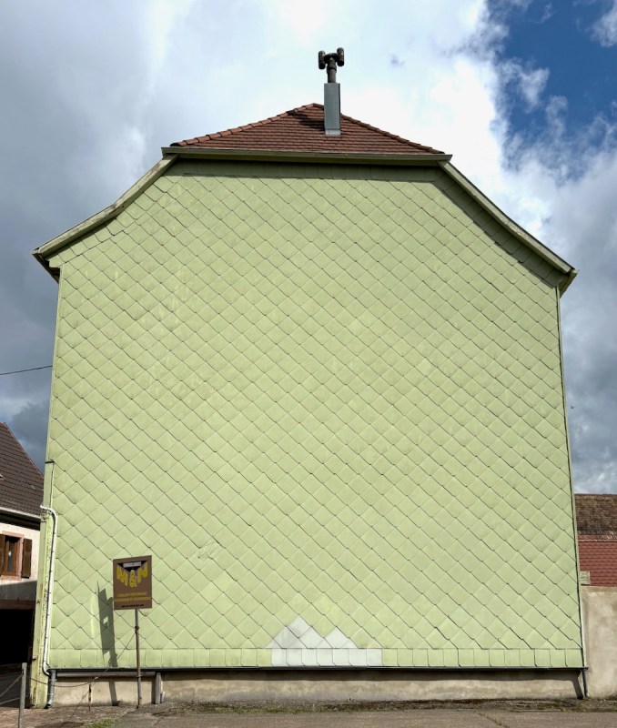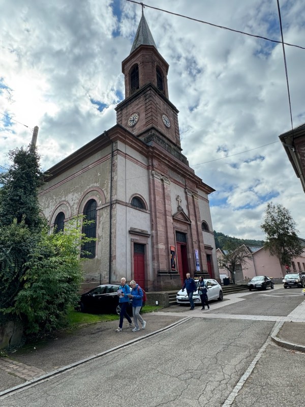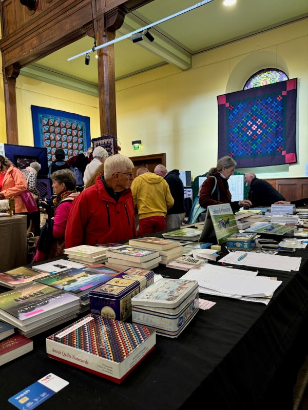 Previously, we arrived in Saint Marie-aux-Mines, and hit the Vendor Mall to start. Then we looked at the exhibits in the Theater (amazing), and now, we head on down the street to Venue 4: the Église des Chaînes, where the exhibit on the Amish is shown. The Anabaptists originally hail from this region, so this show always pays tribute to them by showing their quilts and their handiwork, including a tiny doll bed. (Click to enlarge any photo.)