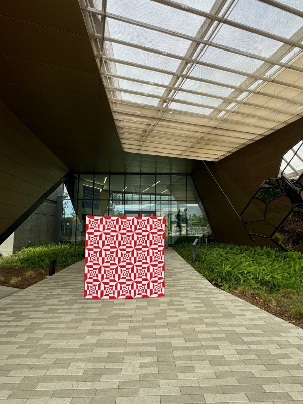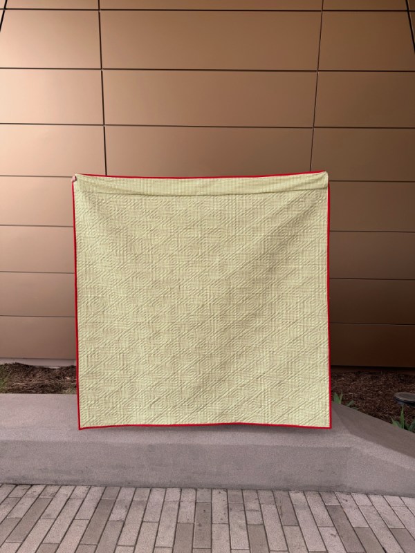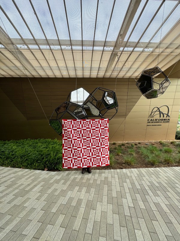 We went over to a favorite place for photos: the exterior entrance of the California Air Resources Board. We had about 6 minutes of sun today and that’s when we snapped these photos. This is quilt number 295 in my Quilt Index. I also get to put it up on my Portfolio of Group Quilts. And I’m thankful for my husband, who gamely goes with me to hold my quilts, and cheers me on.