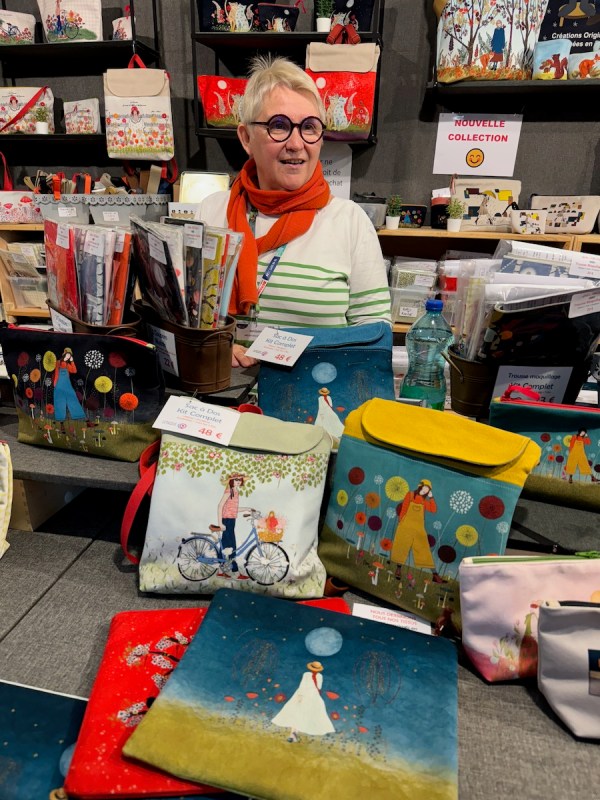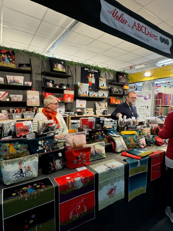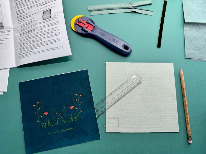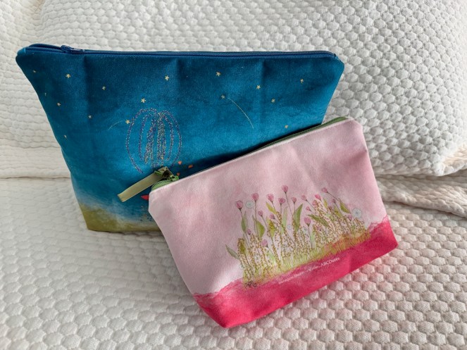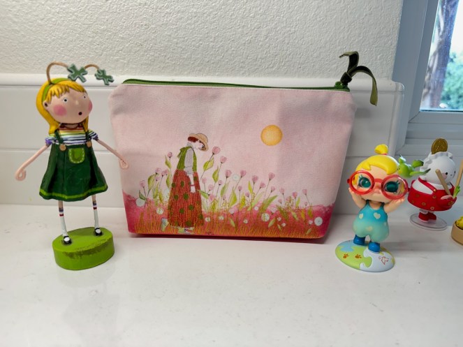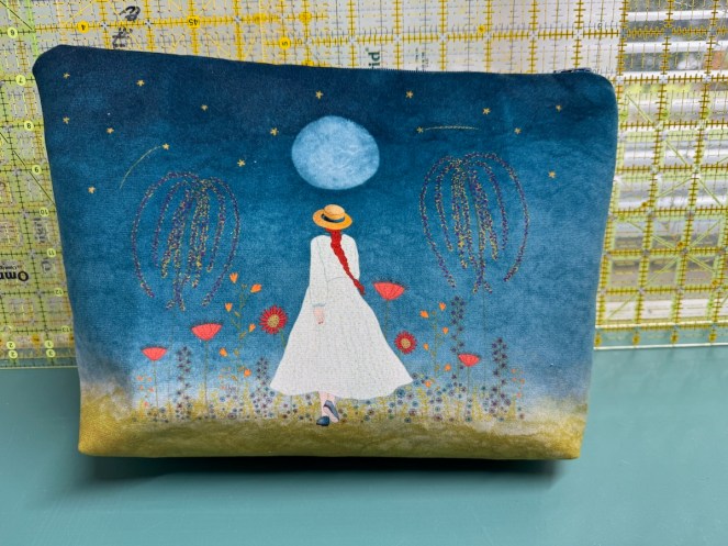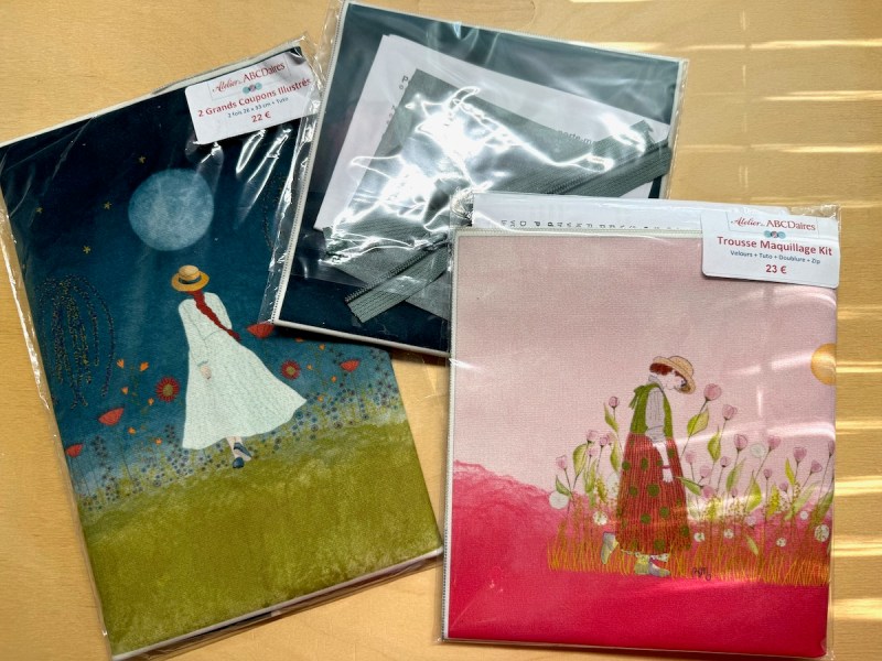 You know when I stood in the shopping area of Carrefour Quilt Show last September (2024), I wanted to buy up all the fabrics and patterns and everything, but alas my suitcase was small, so I had to limit myself. One of the choices was a series of small pouches from ABCDaires, with a soft velvety fabric with absolutely charming printed designs. I tend to buy something that I won’t see in the States, and this fit the ticket. I bought three: two kits and one that just had the printed fabric.